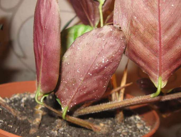 Паяковите акари се заселват и от долната страна на листните плочи, тънки паяжини съобщават за това, това се дължи на ниската влажност в помещението. Листата започват да пожълтяват и се ронят. За да не бъдете ударени от паяк, листата се напръскват от двете страни, организирайте топъл душ на всеки 2-3 дни.