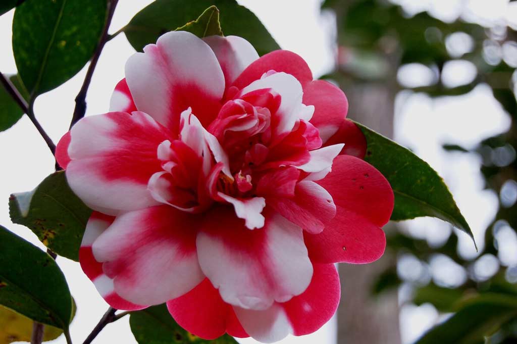 Камелия цвете е малък вечнозелен храст или малко дърво с кожести елипсовидни листа. В градината храстите достигат 1,5 метра височина. Характерно за разклонените стъбла е бързо лигниране. Ако първоначално цветът им е бил зелен, тогава той се променя на сив или кафеникаво-светъл. Издънките са украсени с листа с къси дръжки, растящи последователно, с гладка лъскава повърхност.