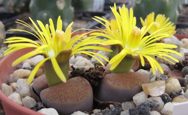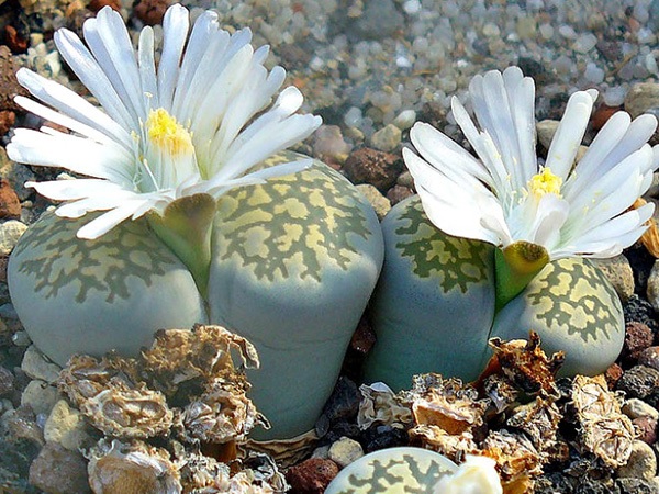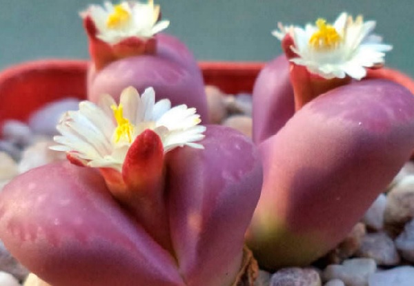 Въпреки че е замаскирано, растение като Lithops може да има много интересни цветя. Любопитно е, че този сукулент рядко цъфти сам. Но група растения и дори засадени в една саксия или контейнер, дават цветя много по-често. Трудно е да ги опишем, тъй като те могат да се различават значително при различните видове. Венчелистчетата им са най-често бели (понякога с розов оттенък) или жълти. Оранжевите екземпляри са много по-рядко срещани.