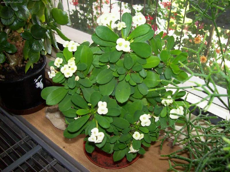 - Мила мухъл (Euphorbia Milii) принадлежи към категорията на бодливите храсти. Горните части на стъблата са осеяни с удължена зеленина. Прицветниците на циантия са оцветени в различни нюанси: бял, розов и жълт. Височината на растение, отглеждано в закрити условия, едва достига 20-25 см. През лятото е важно да се полива еуфорбията на Мила своевременно и да се прилага допълнително торене. Сортът се размножава добре чрез резници и семенни методи. Домашната грижа за Млечни водорасли е съвсем проста. Растението изглежда невероятно през периода, когато започва да цъфти. Грижата за многогодишен сорт не е трудна.