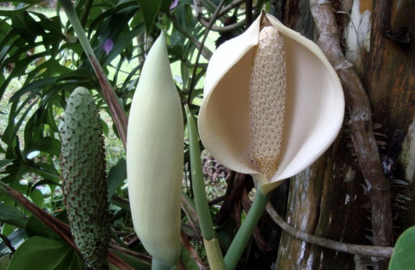 Цветето монстера прилича на голяма бяла, дебела пъпка, с ухо подобно на царевица в центъра. Когато белите листенца увяхнат, това ухо става зеленикаво на цвят. Това предполага, че е узряло, което означава, че можете спокойно да го опитате.
