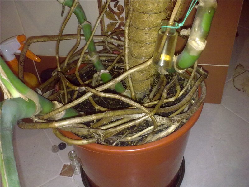 Това предполага възпроизвеждането на цвете чрез издънки с въздушни корени. Честно да ви кажа, този метод, извършен самостоятелно, изисква известни усилия. Но в сравнение с методите, описани по-горе, тук можем да кажем със сто процента гаранция, че възпроизвеждането ще бъде успешно. За да направите това, трябва да намерите издънка с най-големите въздушни корени и да създадете висока влажност за тях. За да постигнете това, можете да увиете корените в мъх, който трябва да се полива или пръска всеки ден. За да предотвратите изсъхването на мъха, препоръчително е да го привържете свободно към багажника, като използвате обикновен филм. Това няма да попречи на корените да растат бързо.