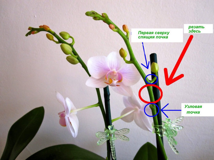 Когато цветното стъбло стане жълто и издънките започнат да изсъхват, резитбата се извършва в основата. За да предотвратите инфекция на орхидеята, поръсете раната със смляна канела и натрошени въглища. Те също използват креда.