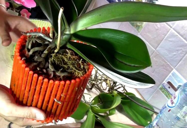 - Орхидеята обича контейнери за размера на кореновата система. Ако корените на растението са здрави, тогава при пресаждането вземете по-голям контейнер с марж за растеж. Болните цветя с повредени корени се нуждаят от саксия от край до край, тъй като голямо количество субстрат ще доведе до стагнация на влагата и разпадане на корените.