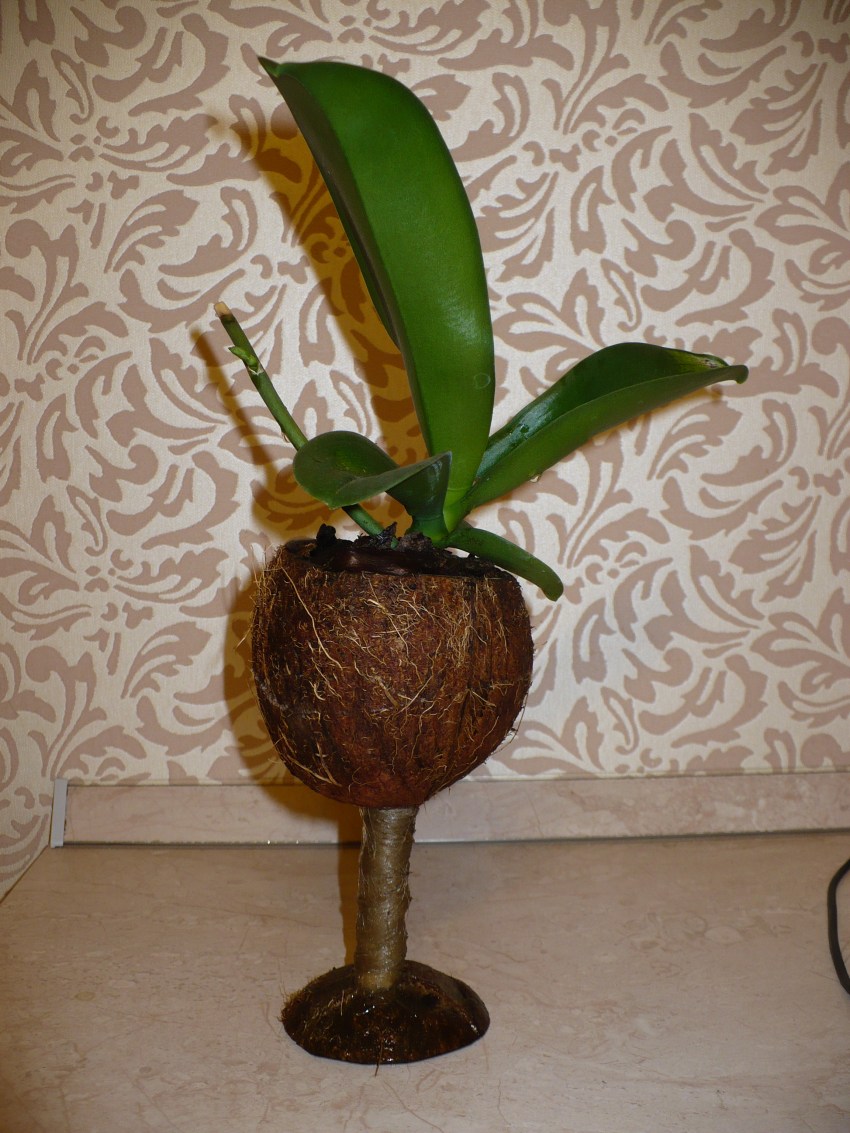 За да придадат оригиналност на съдовете, в които се отглеждат орхидеи, изобретателните производители на цветя са готови да направят саксии със собствените си ръце. Това могат да бъдат плетени кошници, вази с гипсова форма с гипс. Някои хора предпочитат да засадят растението в обикновен голям кокос. Има много опции за създаване на домашна тенджера - всичко зависи от въображението на създателя.