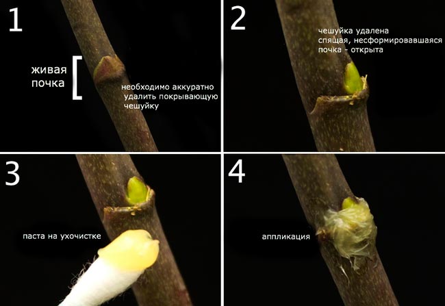 Тази операция не е сложна и се извършва с помощта на цитокининова паста. Намазва се със спящи пъпки на дръжка. Тънките, но плътно прилепнали люспи от бъбреците трябва внимателно да се отстранят (с помощта на пинсета) и да се приложи пастата. След това третираната зона се покрива с мокър мъх от сфагнум.