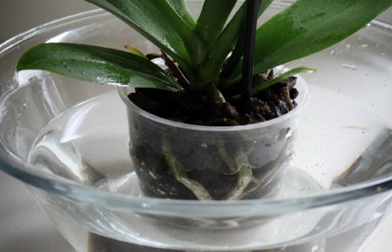 За да може една орхидея да радва окото с буйни цветя, трябва да осигурите правилния режим на поливане за нея. Къпането ще бъде най-ефективно за растението. За да направите това, саксията трябва да бъде напълно потопена в топла вода за пет минути. Така субстратът, който се използва като почва, е наситен с влага. След къпане саксията трябва да се извади от водата и да се остави да оттича излишната влага. След приключване на процедурата, саксията с растението се поставя на място.