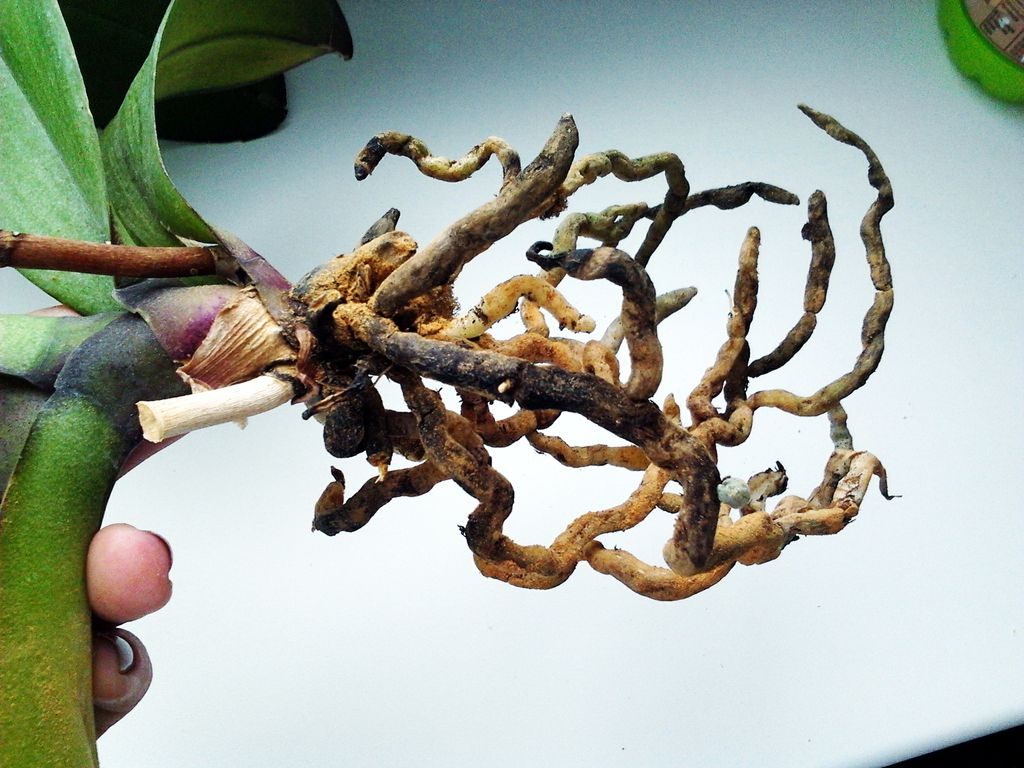 За да проверите корените, ще трябва да извадите цветето от саксията, да разгледате внимателно корените, за да откриете и отстраните изгнилите и изсъхнали, като обработите участъците с канела на прах или въглен. Наличието на солни отлагания от торове се отстранява по същия начин. Можете да възстановите кореновата система по-бързо, като използвате стимулант на растежа на корените.
