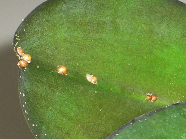 - Щит. Вредителят се размножава много бързо, женските съхраняват яйцата си под черупката. Излюпените ларви са в състояние да се движат. Те пълзят по издънките, търсейки място, където да се закачат с хоботчето си и да останат до зряла възраст и снасяне на яйца. Храната на скалното насекомо е сладкият сок от фаленопсис. Ако поливате почвата в саксия с ентеричен инсектицид. Щитът ще изсмуче отровения сок, което ще провокира смъртта му.