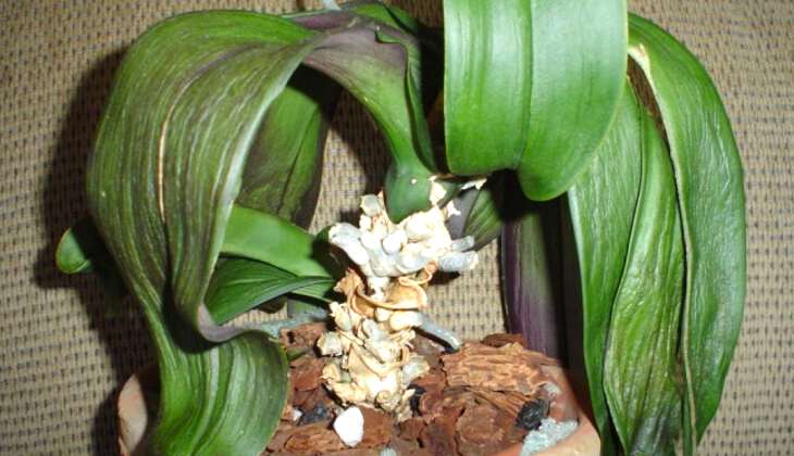 Когато изваждате растението от саксията и разглеждате подземната му част, можете да видите кафяви петна, показващи гниене на корените (в здрава орхидея те са светлозелени). Засегнати са и долните листа, които първо омекват, след това отмират.