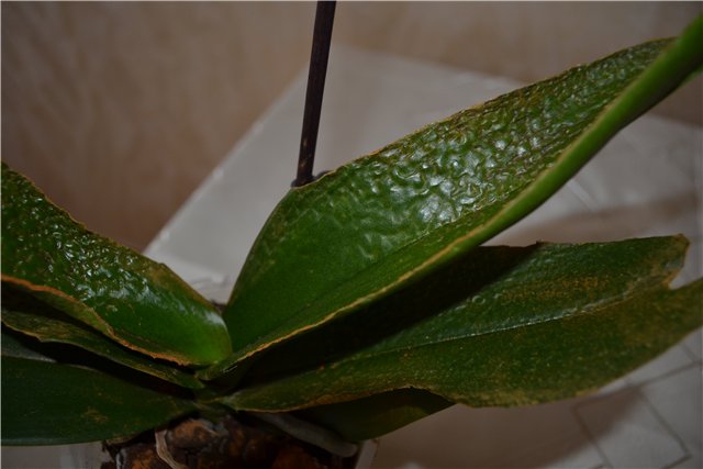 Орхидеите обичат да "пият", но излишната влага е вредна за корените - тя предотвратява циркулацията на въздух в почвата. Ако в същото време субстратът е плътен, тогава подземната част става уязвима от болести, може да изгние. В резултат на това листата на орхидеята изсъхват.