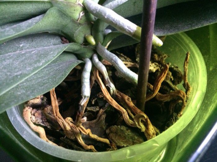 Ако тези фактори не бъдат елиминирани навреме, корените ще изсъхнат, зелената зеленина ще започне да пожълтява, пада и орхидеята бързо ще умре.