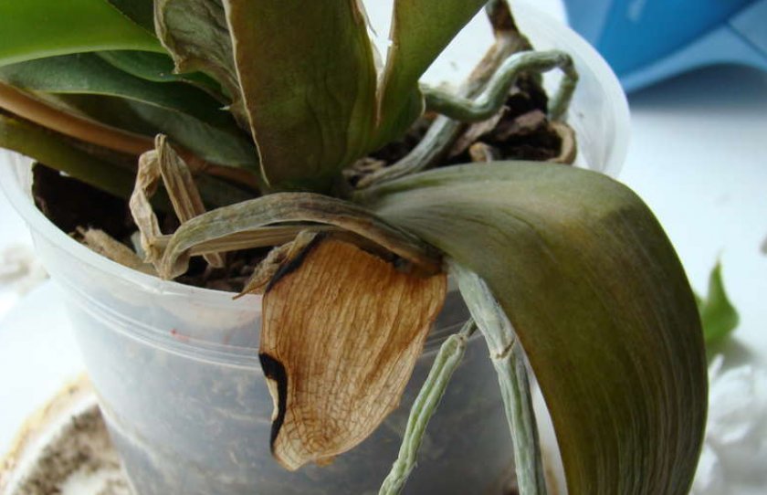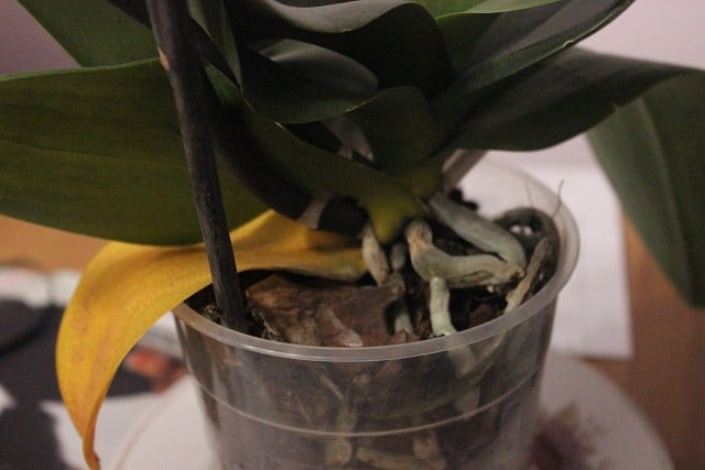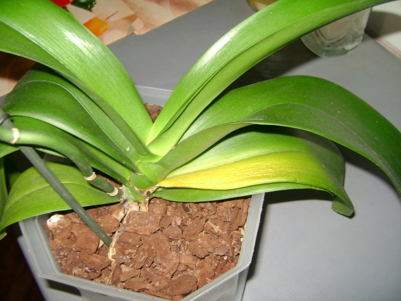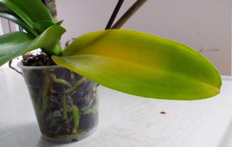Домакинските орхидеи могат да уведомят собственика за необходимостта от трансплантация само чрез пожълтяване на долната листа. Това се случва, когато корените станат твърде тесни в малък контейнер.