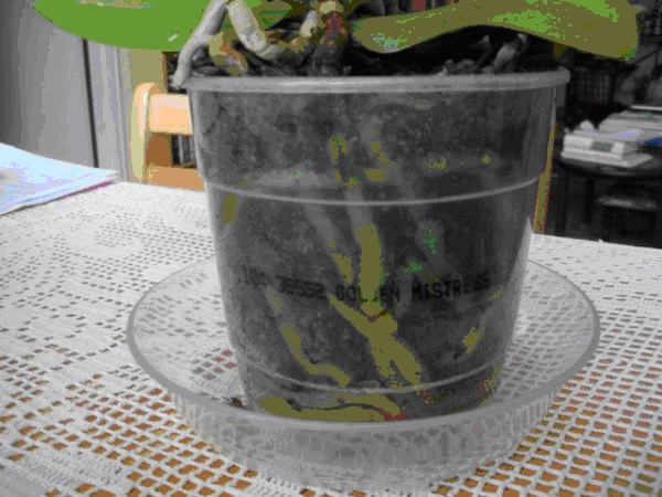 - Орхидеята е засадена в прозрачна саксия. Това дава светлина на корените и позволява да се наблюдава здравето на кореновата система.