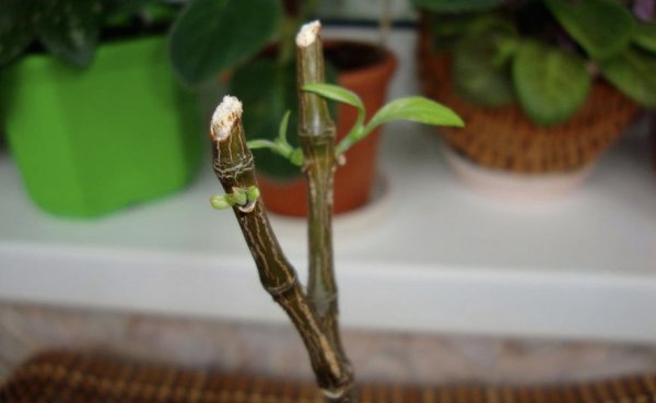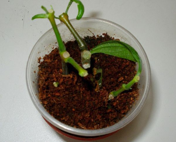 След 14-20 дни на стъблата се появяват първите корени. След като корените са здрави, младото растение трябва да бъде трансплантирано в отделна торфена саксия или пластмасова чаша.