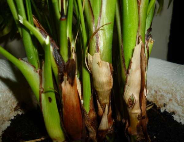 Гниенето на кореновата система е причинено от нарушаване на нормите за поливане на растението. Първите признаци са характерни петна по стъблата и неприятна миризма, излъчваща се от почвата.