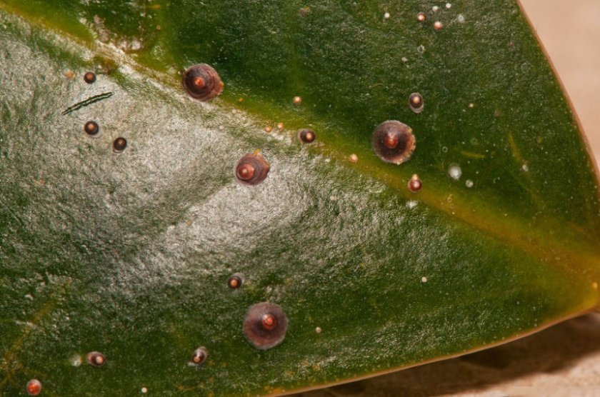 Белезникав хлабав цъфтеж върху листата често показва, че се е появил вредител - брашнеста гъба. Червенокосите петна и петна са симптом на заразяване с паяк. На обратната страна на листа можете да видите зелени или червени туберкули - люспи. Срещу тези вредители стайните растения се третират с Fitoverm или Aktara.