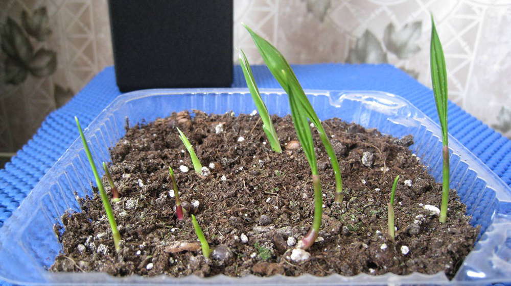 - Първите издънки покълват след няколко месеца. След това тавата се отваря и пренарежда на добре осветено място без пряка слънчева светлина. Веднага щом първият лист се появи на кълна, е време той да отиде в отделна саксия, в специален субстрат за възрастни палми.