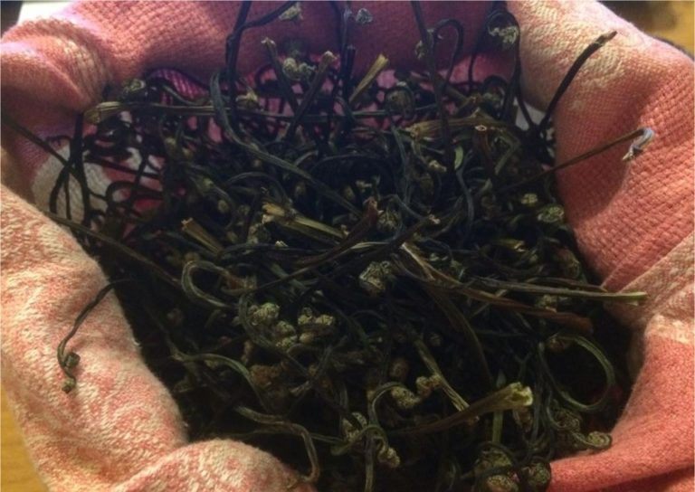 Изсушените пагони се поставят в торбички от плат, които се окачват и остават на чист въздух за още няколко дни, за да изсъхнат при естествена температура и влажност.