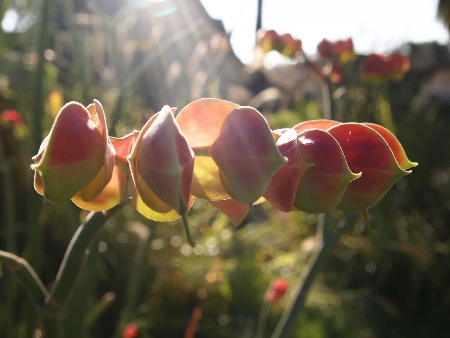 - Едроплоден педилантус - стайно цвете с месести стъбла. Сиво-зеленият сочен растеж може да съхранява вода. Почти атрофираните листни плочи приличат на малки заоблени люспи. Върховете на процесите се образуват червени цветя с лъскави венчелистчета.