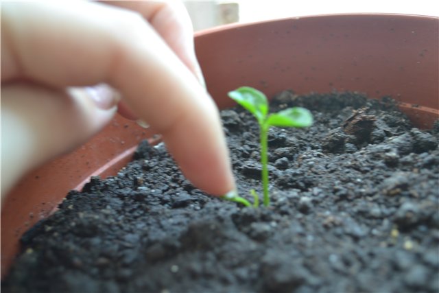 Семената се засаждат в отделен съд с вместимост най-малко 0,1 литра. Можете да използвате буркани с кисело мляко., Трябва да направите дупки в тях, за да се отцеди излишната влага и да се осигури добър дренаж. Семената са заровени най-малко 10 mm дълбоко. Почвата може да бъде закупена в готов вид, или можете да я направите сами в 1 до 1 фракции градинска пръст и торф.