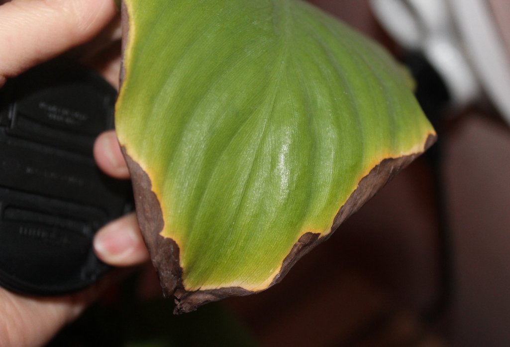 Некрозата на ръба на листата е свързана с неправилно поливане. Почвата в саксията няма време да изсъхне, въздухът не приляга на корените, поради което гнилостните микроорганизми започват да се размножават. Това състояние се влошава от температурата на студения въздух, както и от разположението на саксията на студено място.