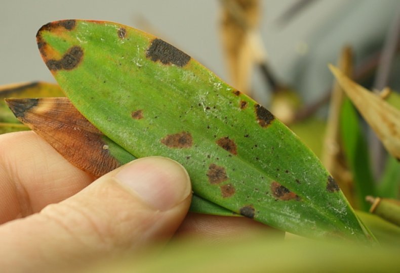 Сухите петна по ръба, появили се поради гниене на коренището, са много по-тъмни от тези петна, които са свързани с недостатъчно поливане и ниска влажност. В последния случай това ще бъдат ярко жълти или светли ивици.