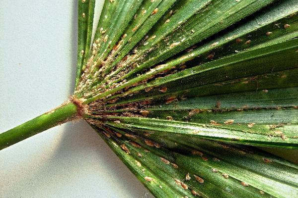 - Паякът е малко насекомо с бледо жълт или светло зелен цвят, локализирано от шевообразната страна на листните плочи.Активната дейност на паразита води до образуването на белезникави петна и най-фините паяжини. Културата спира да се развива, губи имунитета си към много болести, които кърлежите носят. Веднага след като палмата започне да побелява, е необходимо да се започне активна борба срещу паразита.