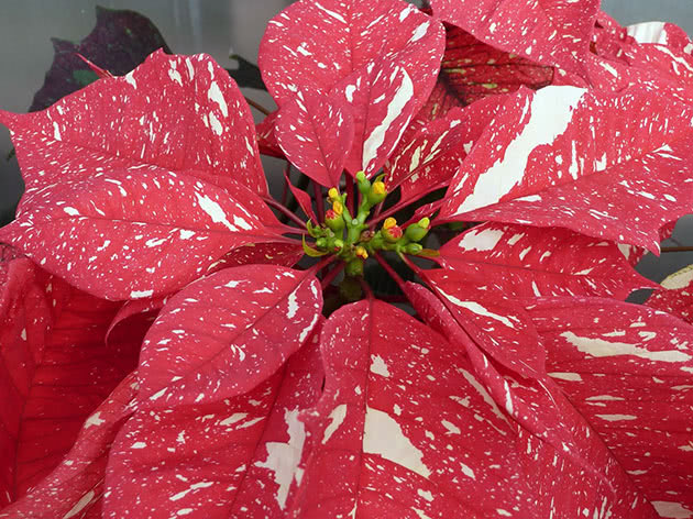 Растения с пъстри листа заслужават специално внимание. Някои от тях имат граница около краищата на цвят, различен от основния нюанс. Други се отличават с леки пръски, хаотично разпръснати по листата. Например, когато разглеждате сорта Jingle Bells, изглежда, че червените листа са покрити със снежинки, разпръснати в безпорядък по повърхността. Прицветниците на други представители, напротив, се отличават с леки венчелистчета, покрити с малки точки от алени пръски.