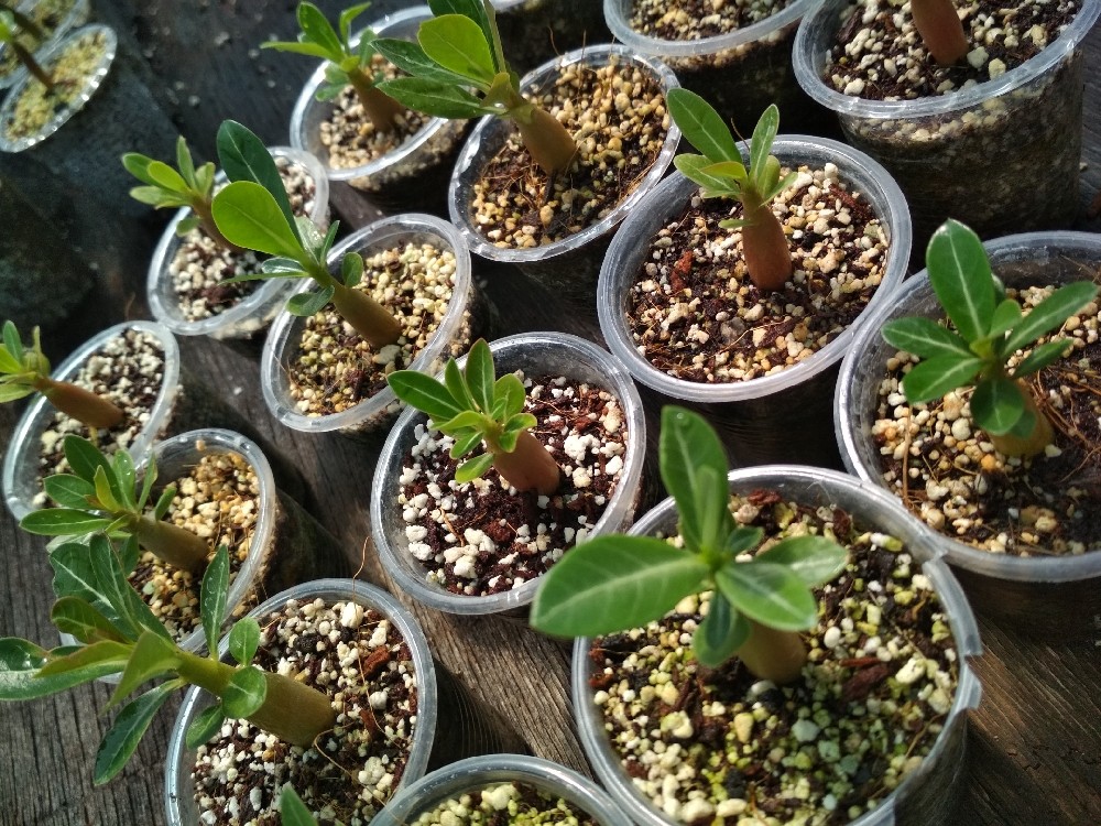 Поливането се извършва въз основа на условията на задържане. При високи температури и интензивно осветление е необходимо често поливане на кълнове от пустинни рози. Кореновата система на разсада е много деликатна, така че почвата не трябва да бъде пресушена или наводнена.