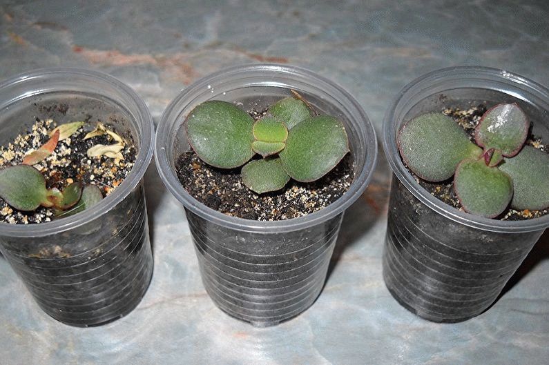 - Лист на дебелата жена се поставя в земята, фиксиран в изправено положение. Поливайте внимателно с пулверизатор. Постепенно растението ще развие корени и ще започне да расте.