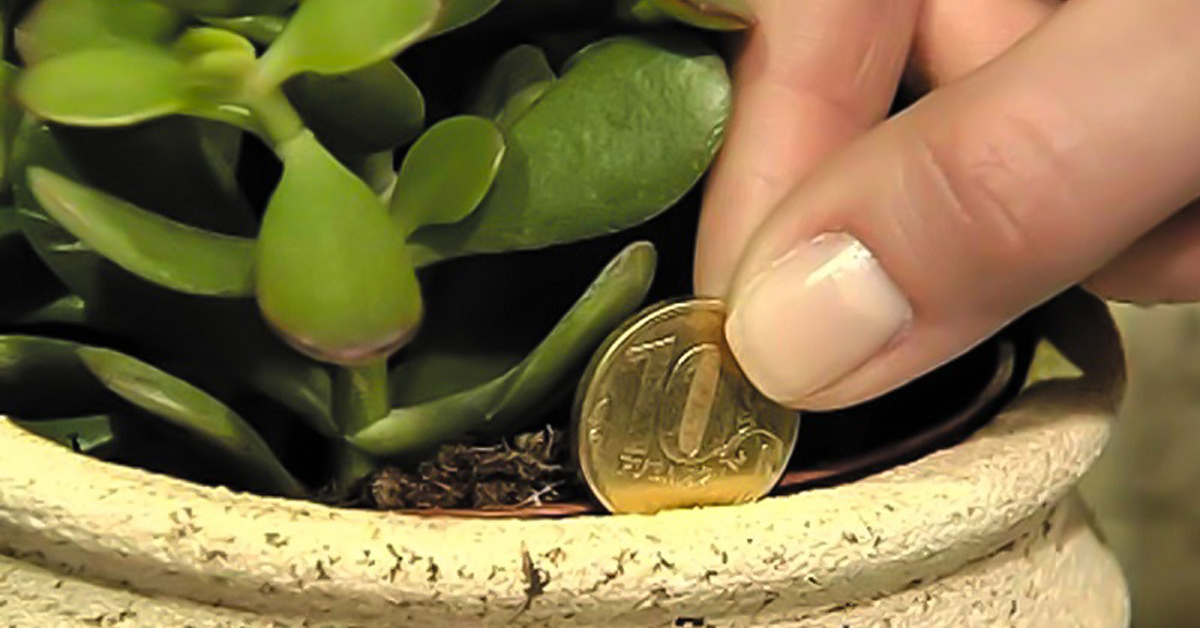 - Поставете четен брой монети в саксията на дренажния слой и след това засадете цветето. По-добре е те да са от една и съща деноминация.