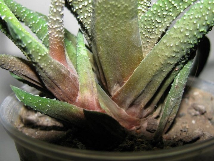 Потъмняването и гниенето по листата е следствие от прекомерната влага. В същото време поливането се спира, засегнатите части на растението се отстраняват и изходът се обработва с фунгицид.