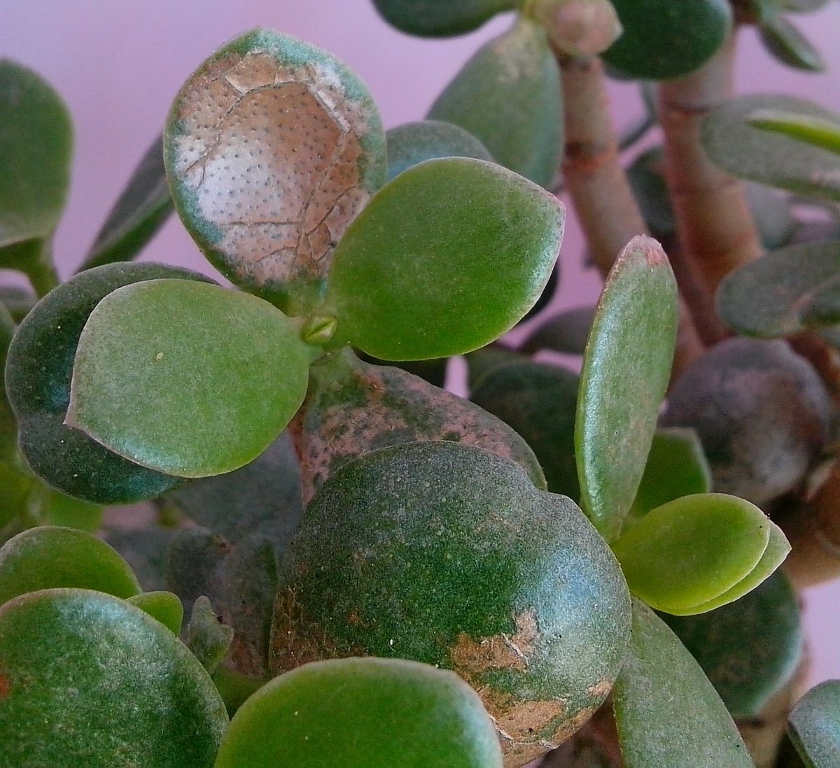 Първо, гъбичките атакуват въздушната част на растението. Листата губят цвят, върху тях се появяват кафяви и кафяви петна с пух, подобни на плесен. Цветът изглежда нездравословно като цяло. Необходимо е лечение с противогъбични лекарства. В противен случай дебелата жена може да умре.