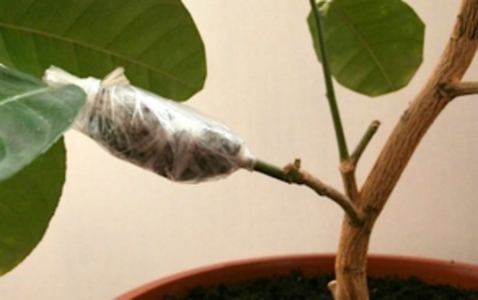 - Въздушно наслояване. Работата трябва да се извърши през пролетта. Мястото на издънките (10 см) е освободено от зеленина. Прави се плитко пръстеновидно изрязване. Увийте почистеното място с мокър мъх от сфагнум или кокосови влакна. Покрийте с фолио отгоре, фиксирайте. След 3 месеца дръжката с корени се трансплантира в отделен контейнер.