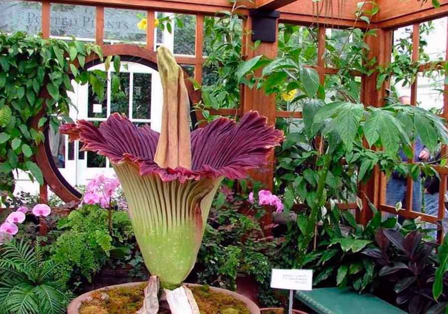 - Amorphophallus титанов или титанов. Оранжерийното растение се получава чрез селекция. Прилича на огромна обърната камбана с диаметър до 3,5 м и височина до 2 м. Гигант се отглежда от грудка с тегло 20-25 кг.