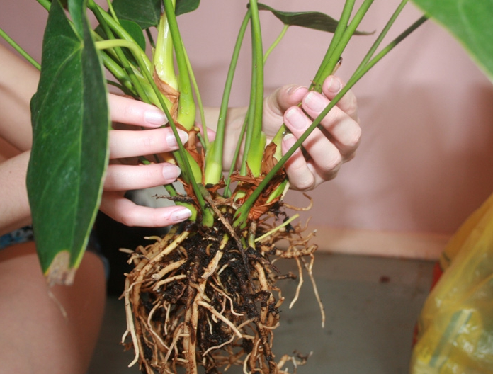 Разпадането на корените е най-често срещаният проблем с антуриума. Това заболяване е свързано с неправилно поливане. В този случай листата пожълтяват и изсъхват. Болно растение се изважда от земята, изследва се кореновата система и се премахват изгнилите участъци. Резените се поръсват с натрошен въглен и се оставят за няколко часа на открито. Когато резените изсъхнат, цветето се засажда в нов субстрат. Напръскайте листата с Epin и покрийте растението с прозрачна торбичка.