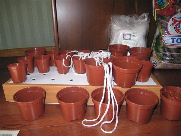 - Пригответе фитила. За едната саксия ще ви е необходим разрез с дължина около 20 см, единият край на който е поставен в спирала на дъното на саксията, а другият е поставен в съд с вода.