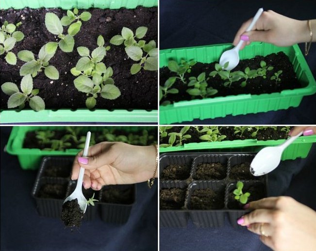 - Разсадът се изважда от стария контейнер с помощта на лъжица. На кореновата система трябва да остане земна бучка.