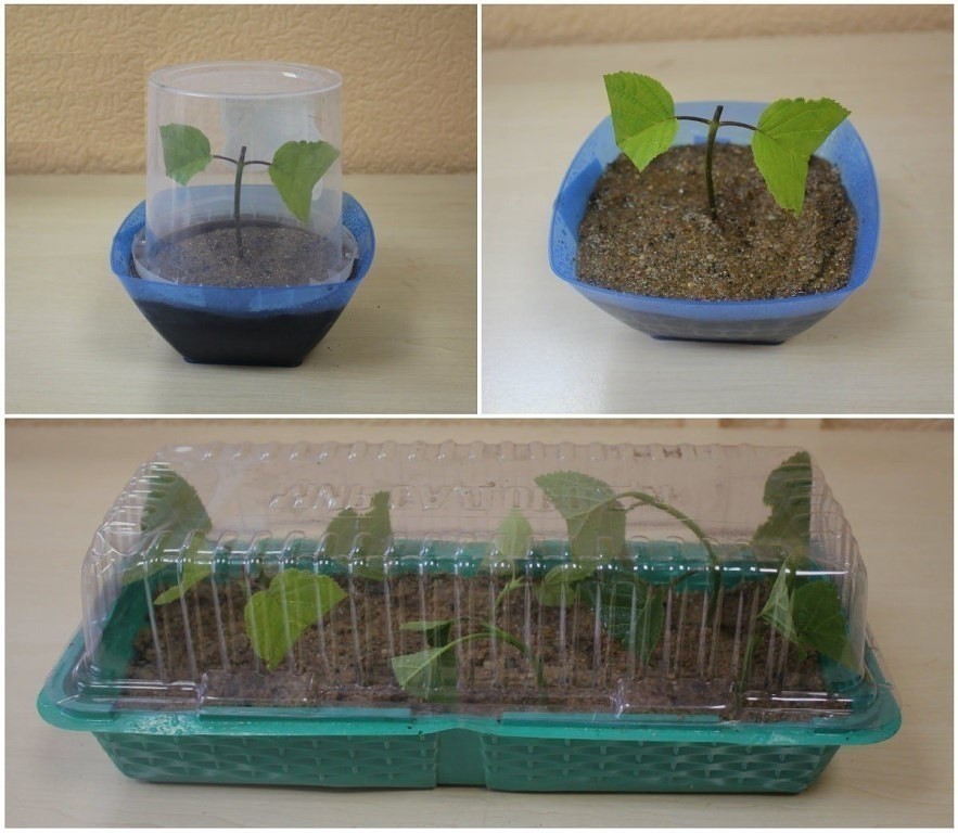 Детайлите се поставят в саксии, покрити със стъклени буркани. Проветрявайте всеки ден. Осветлението трябва да е налично, но не на пряка слънчева светлина. Разсадът ще бъде готов след 3-4 седмици.
