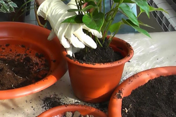 - Растението се навива със земна буца в нов съд и се поръсва с пръст, без трамбоване.