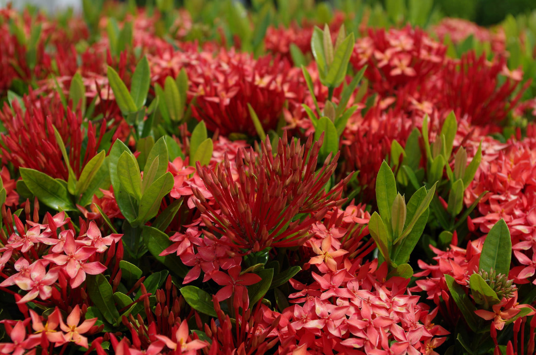 Ixora Javanica, както се нарича още, е двуцветна с оранжево оцветени червени цветя. Листата са овални, заострени по краищата. Може да нарасне до 130 cm.