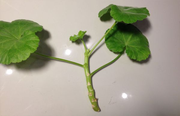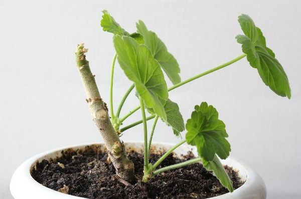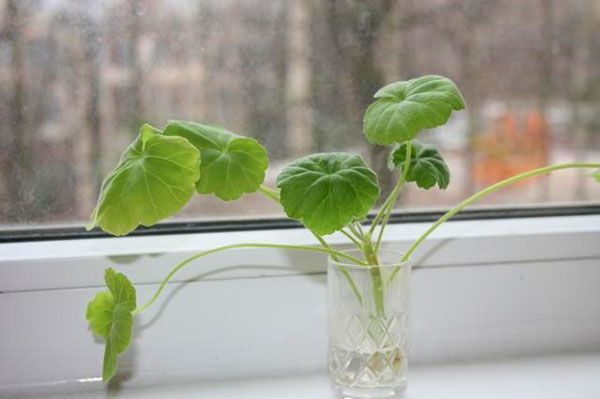 За покълване във вода е препоръчително да използвате всеки тъмен съд.Ястията подлежат на задължителна дезинфекция. Преди това активен въглен се добавя в съд с топла, утаена вода. След това дръжката се поставя в саксията. Мястото е избрано възможно най-осветено, но без пряка слънчева светлина. Дневните часове за пеларгония продължават 14-16 часа.