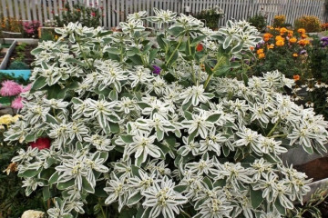 Сортът се отличава със специален цвят на листата. Те са по-леки от обикновено, докато са покрити с хаотични петна и ивици от бели, кремави и розови нюанси. Около ръба може да има червеникава граница. Вариегата цъфти предимно с червени и коралови цветя.