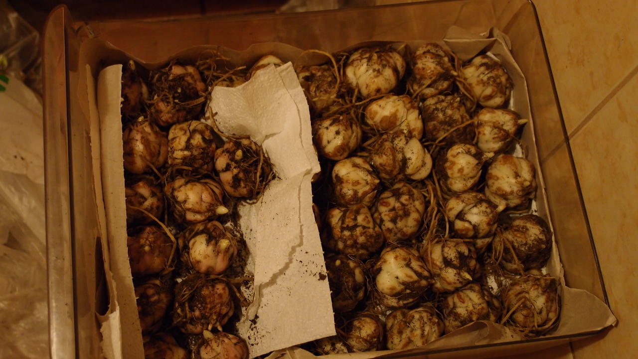 Първо извадете буца пръст и внимателно я разглобете, като извадите внимателно луковиците. Големите екземпляри трябва да се изплакнат под леко топла и течаща вода, след което да се отреже издънката на 5 см от крушката. След това всичко трябва да се постави в контейнер и да се напълни с разтвор на калиев перманганат за половин час. Сега трябва да оставите луковиците да изсъхнат на чист въздух за два часа. През това време можете да приготвите дървени стърготини и мъх, като ги поставите в найлонов плик. Там се поставят и крушките. Цялото съдържание се носи в хладилника или мазето. Това ще запази луковиците, докато не бъдат засадени.