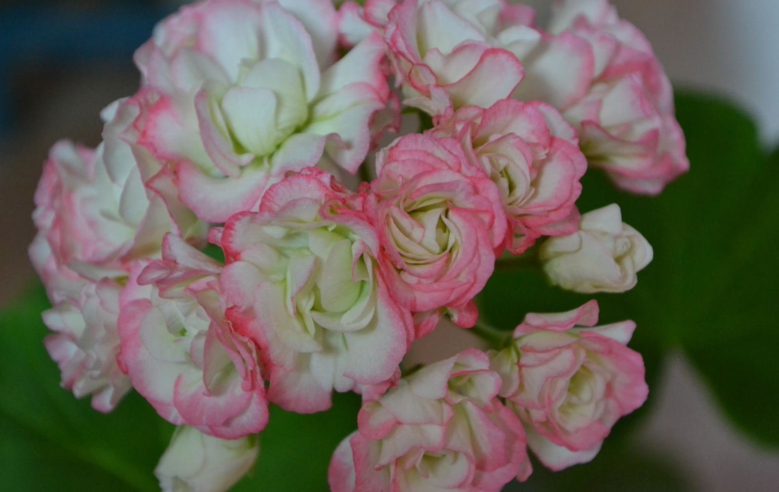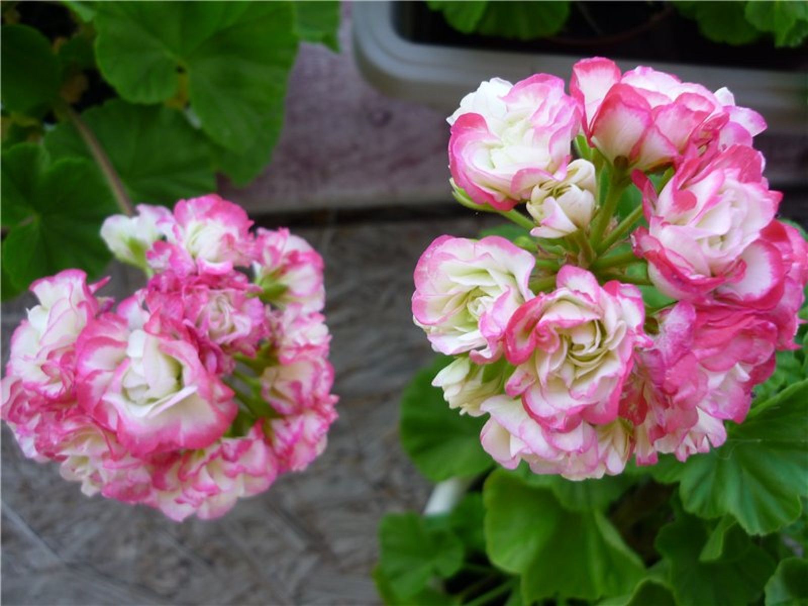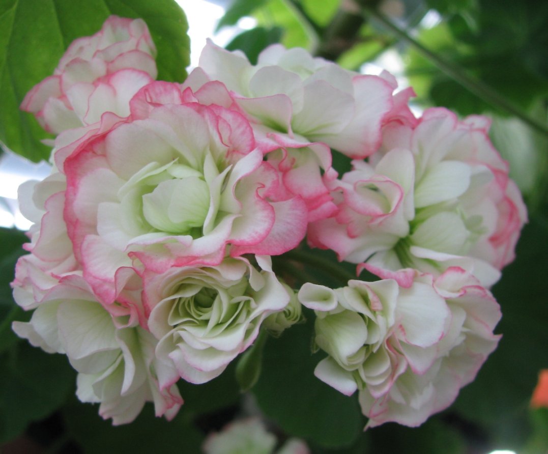 Този сорт пеларгония се отличава с елегантни петнисти венчелистчета. Снежнобялите цветя са украсени с розови кантове и петънца. Листата са елегантни, яркозелени.