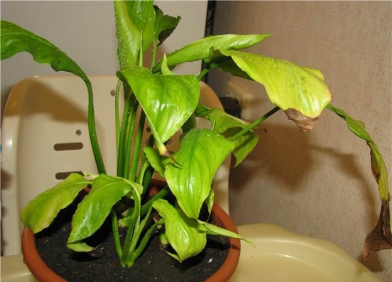 Растението спатифилум има зелено цвете: защо? Често цъфтежът със зелен оттенък се дължи на неправилна технология на торене. Тази ситуация може да възникне както от изобилие, така и от липса на хранителни вещества. Друга причина, поради която цветето спатифилум е станало зелено, е недостатъчното осветление в стаята. Ако току-що появилите се цветя са боядисани в бяло и след това променят цвета си, тогава режимът на осветление в стаята спешно се коригира.