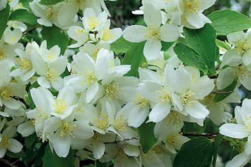 - Сортове жасмин от прислужницата от Орлеан. Сортът се отличава с бързия си темп на растеж и непретенциозността. За да се постигне обилен цъфтеж и правилната форма, храстът трябва да бъде отрязан. Цветята остават на растението не повече от един ден, след това падат и до тях се образуват нови. Напречното сечение на цветето е 1,5 cm.