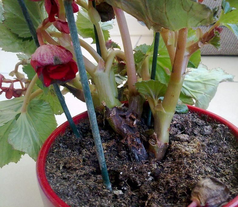 Възниква поради прекомерно поливане. По листата и издънките на бегонията се появяват тъмни петна, а кореновата част на храста започва да се покрива с лепкав цвят. Скоро засегнатите области могат да изсъхнат и да отпаднат.