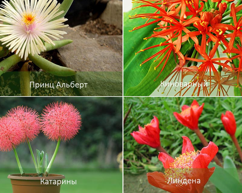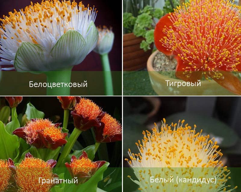 - Hemantus multiflorus (Haemanthus multiflorus) - има леко жилава зеленина, на високи дръжки се образуват съцветия от аленочервени и бледо розови тонове.